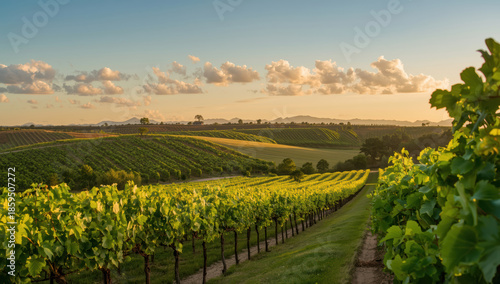 Fototapeta premium Rolling vineyard hill sunset landscape with golden light and soft clouds