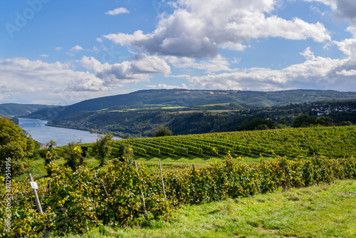© MotionLoop, Fototapeta premium Rolling vineyard hills on the Rhine Valley with small towns and the Rhine River in the distance, Germany