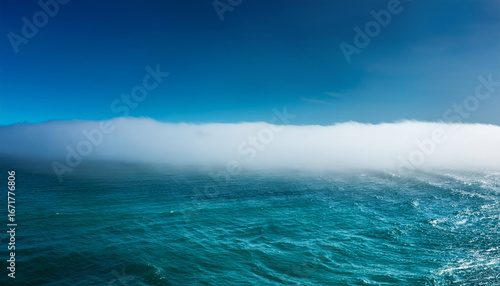 Fototapeta premium rolling white fog bank over a teal ocean horizon