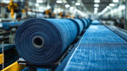 © Joachim, Obraz premium Rolls of denim fabric on display in a textile manufacturing facility during daytime operations