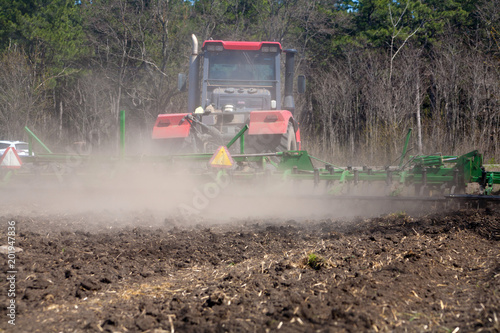 Fototapeta premium Rolnik w ciągniku przygotowuje ziemię z kultywatorem przedsiewnym