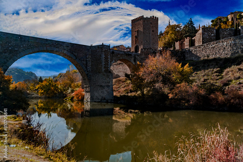 © JUAN ANTONIO, Fototapeta premium Roman bridge and tower over the Tagus river, Toledo, Spain.