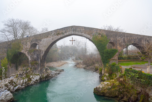 Fototapeta premium Roman bridge over the river in Cangas de Onis, Asturias. cloudy sky with fog