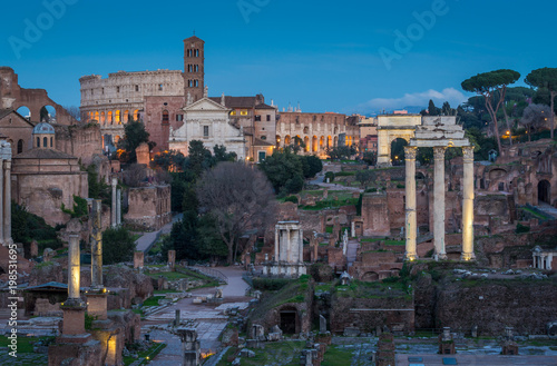 Obraz premium Roman Forum and Colosseum at sunset as seen from the Campidoglio Hill, Rome, Italy.