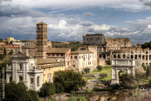Fototapeta premium Roman Forum. The Temple of Venus and Roma, Church of Santa Francesca Romana, The Arch of Titus, The Colosseum. Rome, Italy.