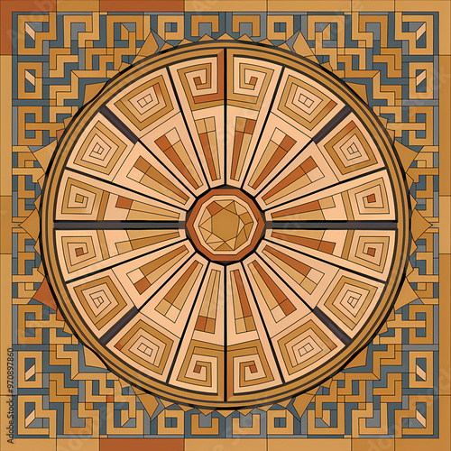 Naklejka premium Roman mosaic mandala with a central sunburst motif