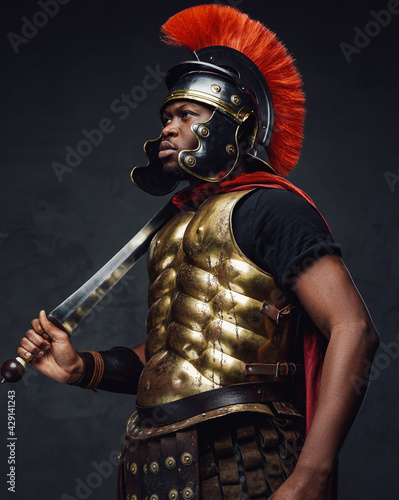 Naklejka premium Roman warrior holding gladius on his shoulder