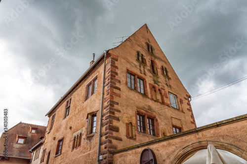 © Elenarts, Fototapeta premium Romanesque house of the Rathsamhausens at street of Pelerins 8 by day, Obernai, Alsace, France