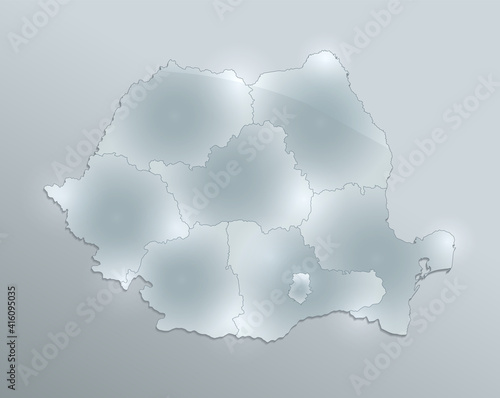 © Monika Huňáčková, Fototapeta premium Romania map and flag, administrative division, separates regions and names individual region, design glass card 3D blank