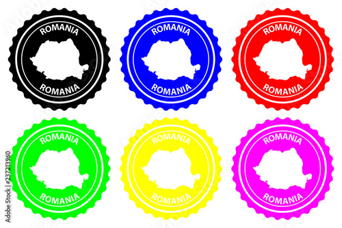 © danlersk, Obraz premium Romania - rubber stamp - vector, Romania map pattern - sticker - black, blue, green, yellow, purple and red