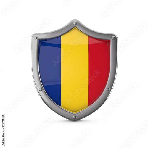 Fototapeta premium Romania security concept. Metal shield shape with national flag