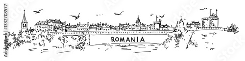 © Kaz, Fototapeta premium romanian city skyline doodle black vector ink sketch