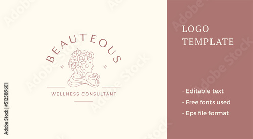 © provectors, Fototapeta premium Romantic ancient woman head blossom rose flower wreath organic natural beauty care line logo vector
