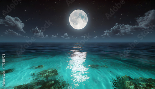 © Oleksiy, Fototapeta premium romantic and scenic panorama with full moon on sea to night