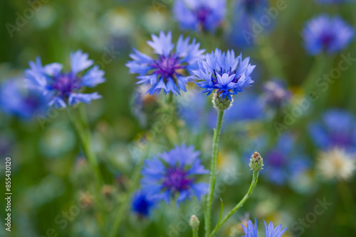Fototapeta premium Romantic blue cornflowers in backlight with smooth green and blue background, shallow depth of field