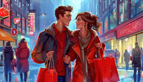 Obraz premium Romantic city scene, couple with shopping bags, Valentine's Day date, high resolution, vivid colors.