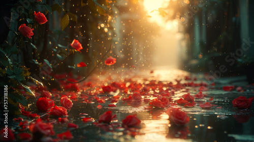 © Creative Valley, Naklejka premium Romantic Corner in Kolkata at Dawn, Red Roses from the Sky