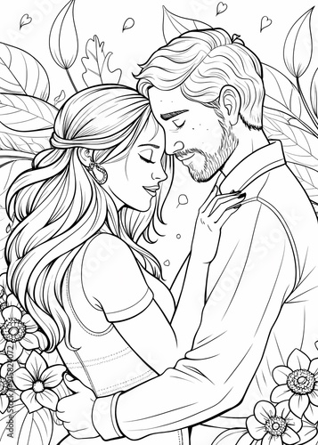 Obraz premium Romantic Couple Embracing Amidst Nature Coloring Page for Love and Serenity
