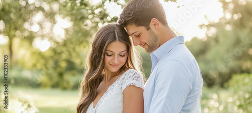 Fototapeta premium Romantic couple embracing in sunlit park, expressing love and happiness