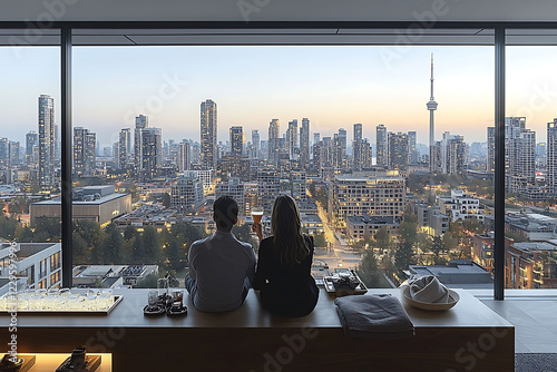 © SolaruS, Obraz premium Romantic couple enjoying city skyline view from luxury apartment at sunset. Stylish interior design, perfect for travel, real estate, or lifestyle marketing.