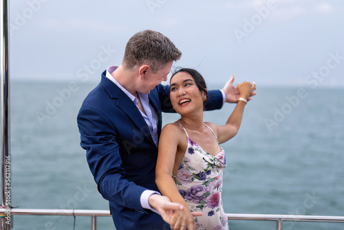 © Tongpool, Obraz premium Romantic couple in love have fun sailing in the sea standing on yacht deck enjoy amazing view