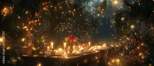 © Sinahil, Naklejka premium Romantic dinner setting with glowing candles, fairy lights, and floral details-4