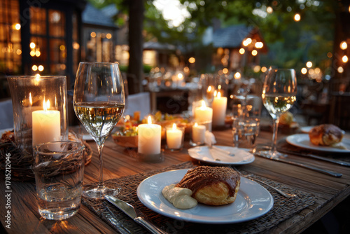 Fototapeta premium Romantic Dinner Table Setting Outdoors at Twilight