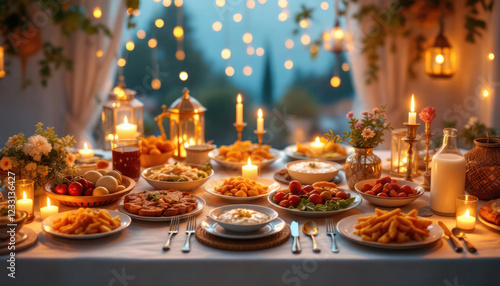 © Zaenatulumma, Naklejka premium Romantic Dinner Table Setting with Candles and Delicious Food