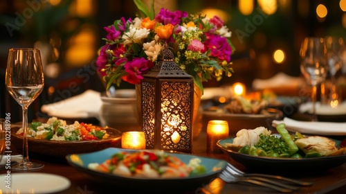 Naklejka premium Romantic Dinner Table Setting With Flowers And Candles