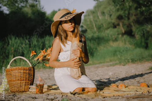 © vita, Obraz premium Romantic dreamy little girl in hat sitting on sandy beach with baguette and picnic basket. Soft glow effect. Memories from childhood. Photo with sense of nostalgia. Elegant dressed calm female kid.