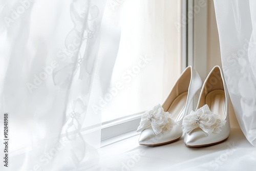 © ggamyuii, Obraz premium Romantic Elegance: Bridal Shoes by the Window