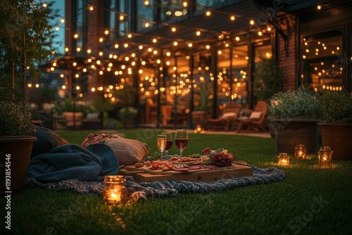 © miss_fortuna, Naklejka premium Romantic evening picnic under string lights. Generative AI