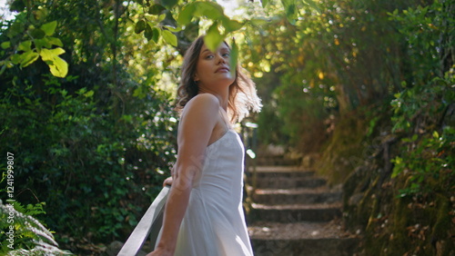 Naklejka premium Romantic girl strolling park stairs enjoying calm summer nature beauty closeup