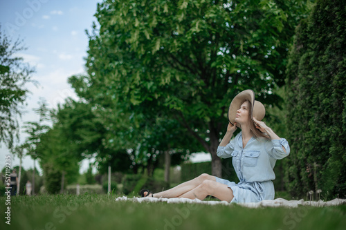© grthirteen, Naklejka premium Romantic girl with hat on picnic in park