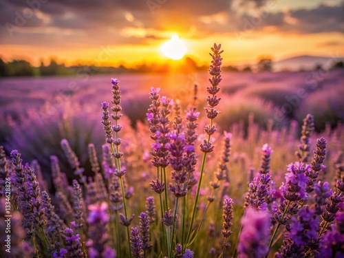 © Arnada, Naklejka premium Romantic Lavender Field at Sunset: Vibrant Purple Flowers and Golden Hour Light