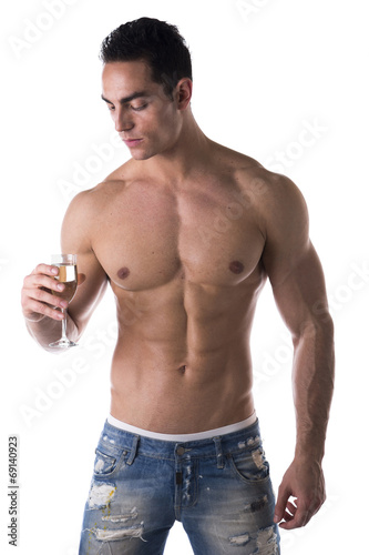 Fototapeta premium Romantic muscular shirtless young man looking at champagne flute