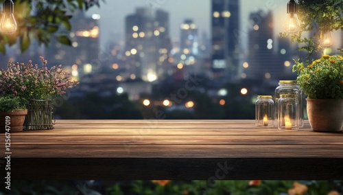 Fototapeta premium Romantic Night Cityscape with Wooden Table, Plants, and Lights