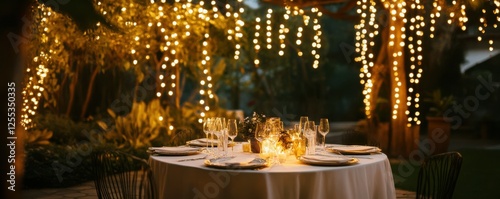 © Настя Шевчук, Obraz premium Romantic outdoor dinner setting with string lights and elegant table arrangement