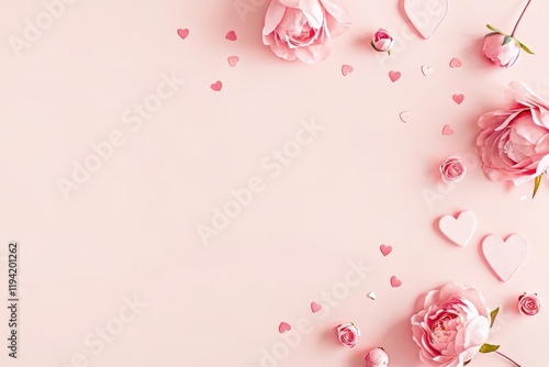 Fototapeta premium Romantic Pink Roses Hearts Confetti Background