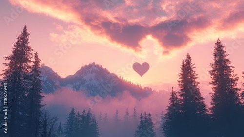© Faizal, Obraz premium Romantic Pink Sunset Heart Shaped Cloud over Snowy Mountain and Pine Forest