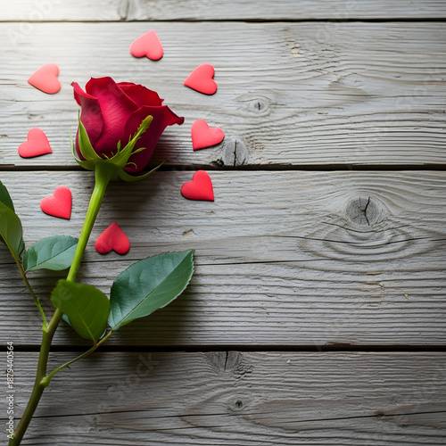 © Joyanto, Fototapeta premium Romantic red rose with pink heart shaped confetti on wooden background