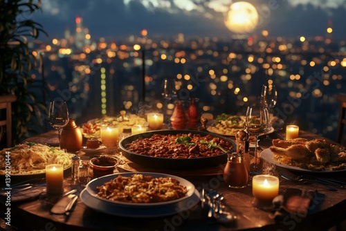 Naklejka premium Romantic rooftop dinner overlooking city lights