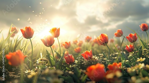 © Sri, Fototapeta premium Romantic Scene of Tulips in a Field Blowing with Gentle Breeze