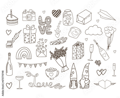 Obraz premium Romantic set for Valentine's Day of hand drawn elements in doodle style,...