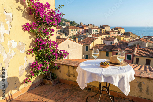 © Jumpingsack, Obraz premium Romantic setting with white wine on a terrace overlooking a picturesque Italian coastal town. Perfect summer holiday, travel, or honeymoon concept.