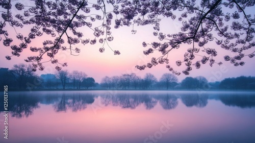 Fototapeta premium Romantic Spring Evening with Cherry Blossom Trees Silhouetted Against a Soft Pink and Lavender Sky, Twilight Glow Reflecting on a Calm Lake