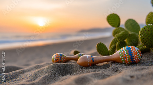 © Abul, Obraz premium Romantic Sunset Over Mexican Seashore Featuring Musical Instruments on Sandy Beach with Cactus Close-Up