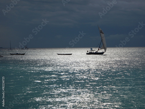 © luciezr, Naklejka premium romantic sunset with a boat on the ocean