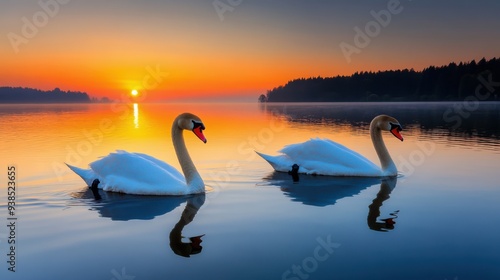 © diowcnx, Naklejka premium Romantic Swans at Sunset