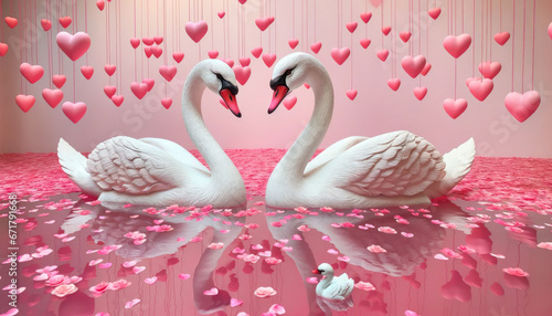 Fototapeta premium Romantic swans making a heart shape, Swan couple for Valentine's Day on pink background